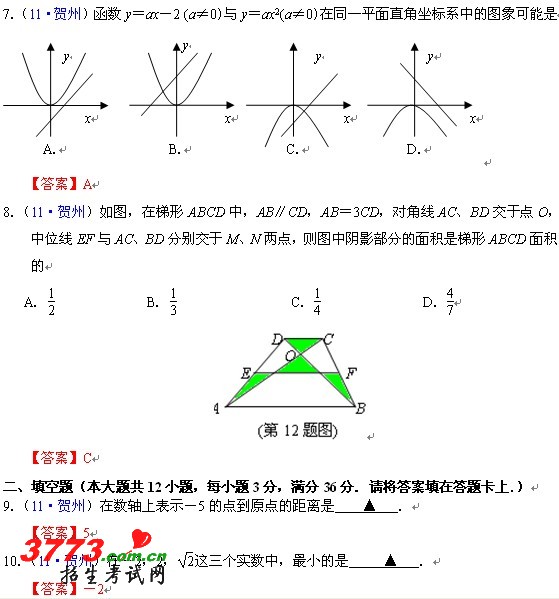一、选择题:(本大题共8小题,每小题3分,满分24分.在每小题给出的四个选项中,只有一项是正确的,用2B铅笔把答题卡上对应题目的答案标号涂黑.)