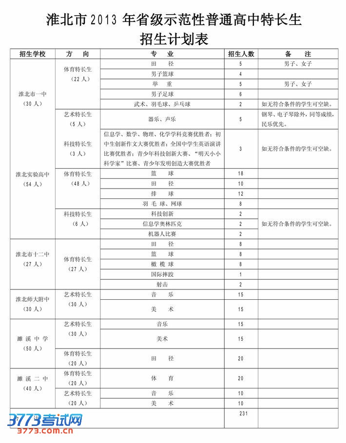 [图文]淮北市2013年省示范性高中特长生招生计划表
