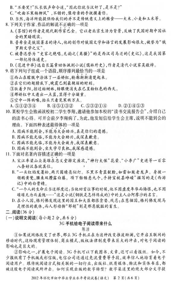 [组图]怀化市2012年中考语文试卷答案评分标准