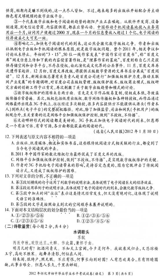 [组图]怀化市2012年中考语文试卷答案评分标准