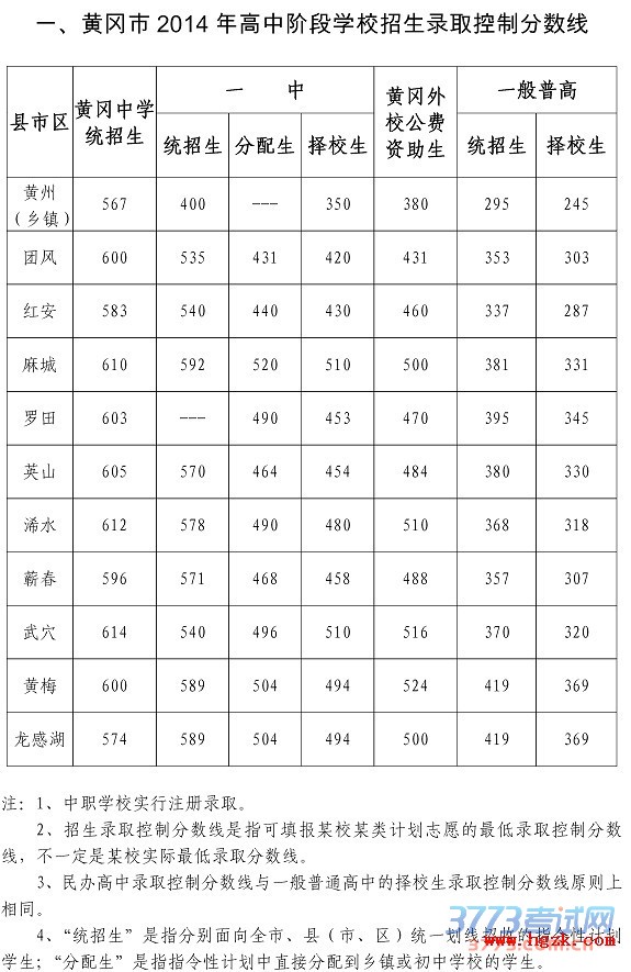 经黄冈市统筹高中阶段学校招生工作领导小组研究同意,我市2014年高中阶段学校招生录取控制分数线已经确定,现予以公布: