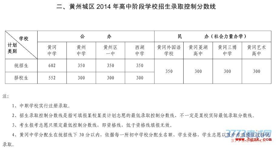 一、黄冈市2014年高中阶段学校招生录取控制分数线(见表一)