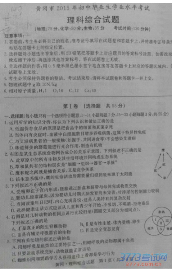 2015黄冈中考理综物理化学生物试题及答案试题、答案和中考作文。祝各位考生都能取得好的成绩。2015年湖北黄冈中考试题:中考理综试题(图片版):