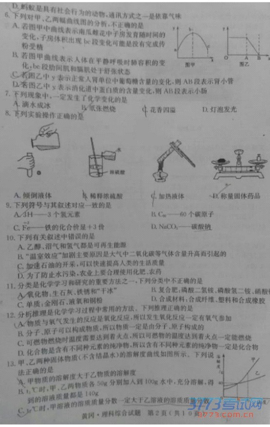 [组图]2015黄冈中考理综物理化学生物试题及答案