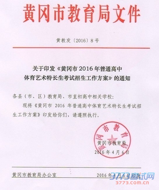 黄冈市2016年普通高中体育艺术特长生考试招生工作方案