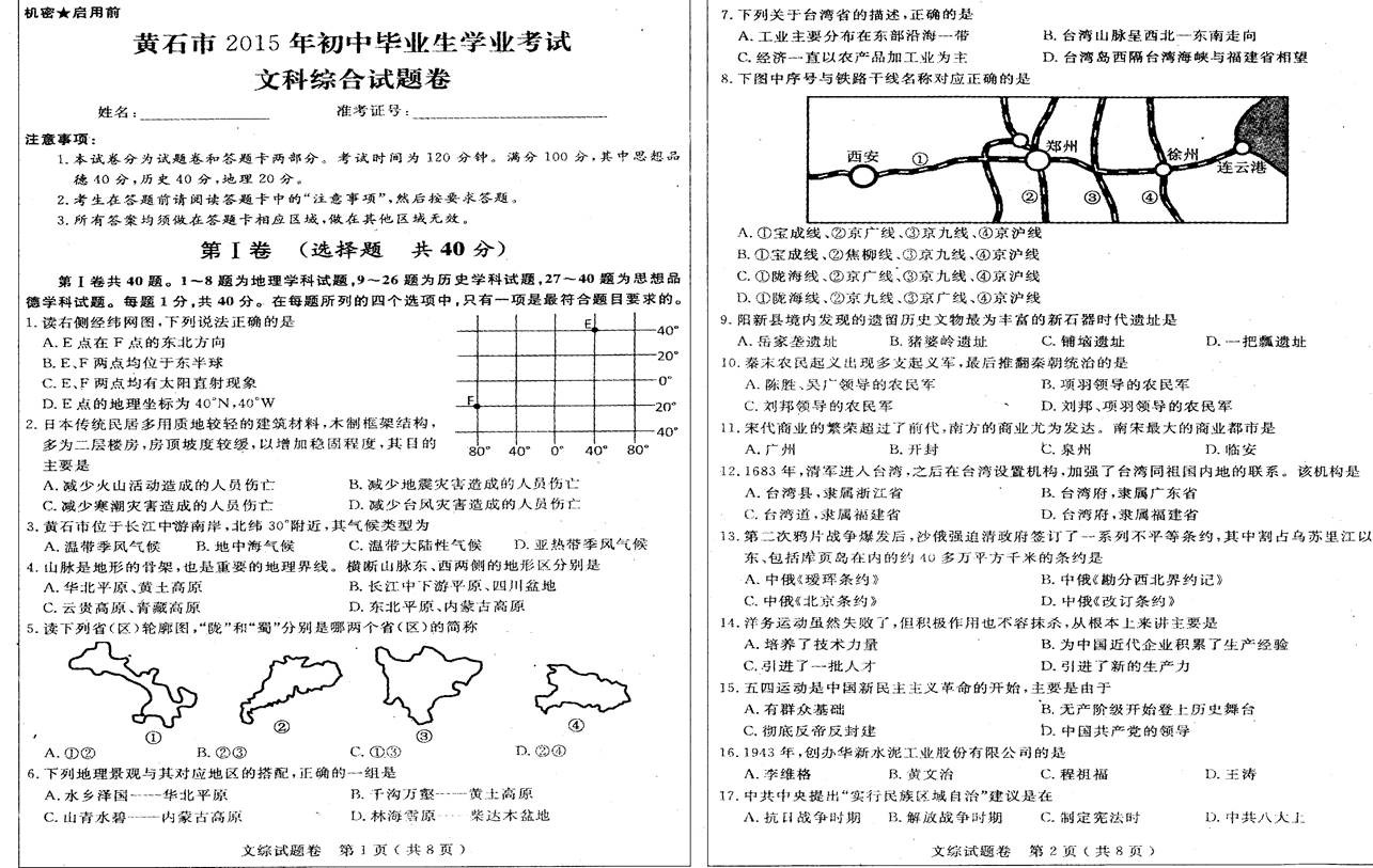 及时公布中考试题、答案和中考作文。祝各位考生都能取得好的成绩。2015年湖北黄石中考文综试题及答案(图片版):
