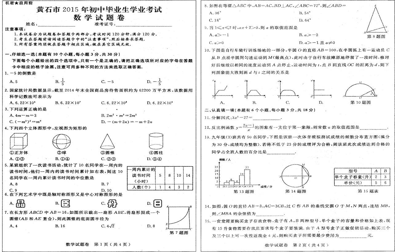 [组图]2015黄石中考数学真题及答案发布