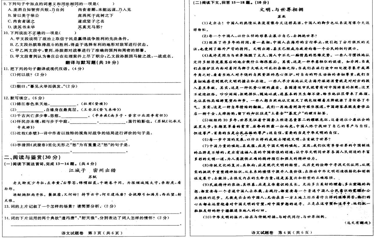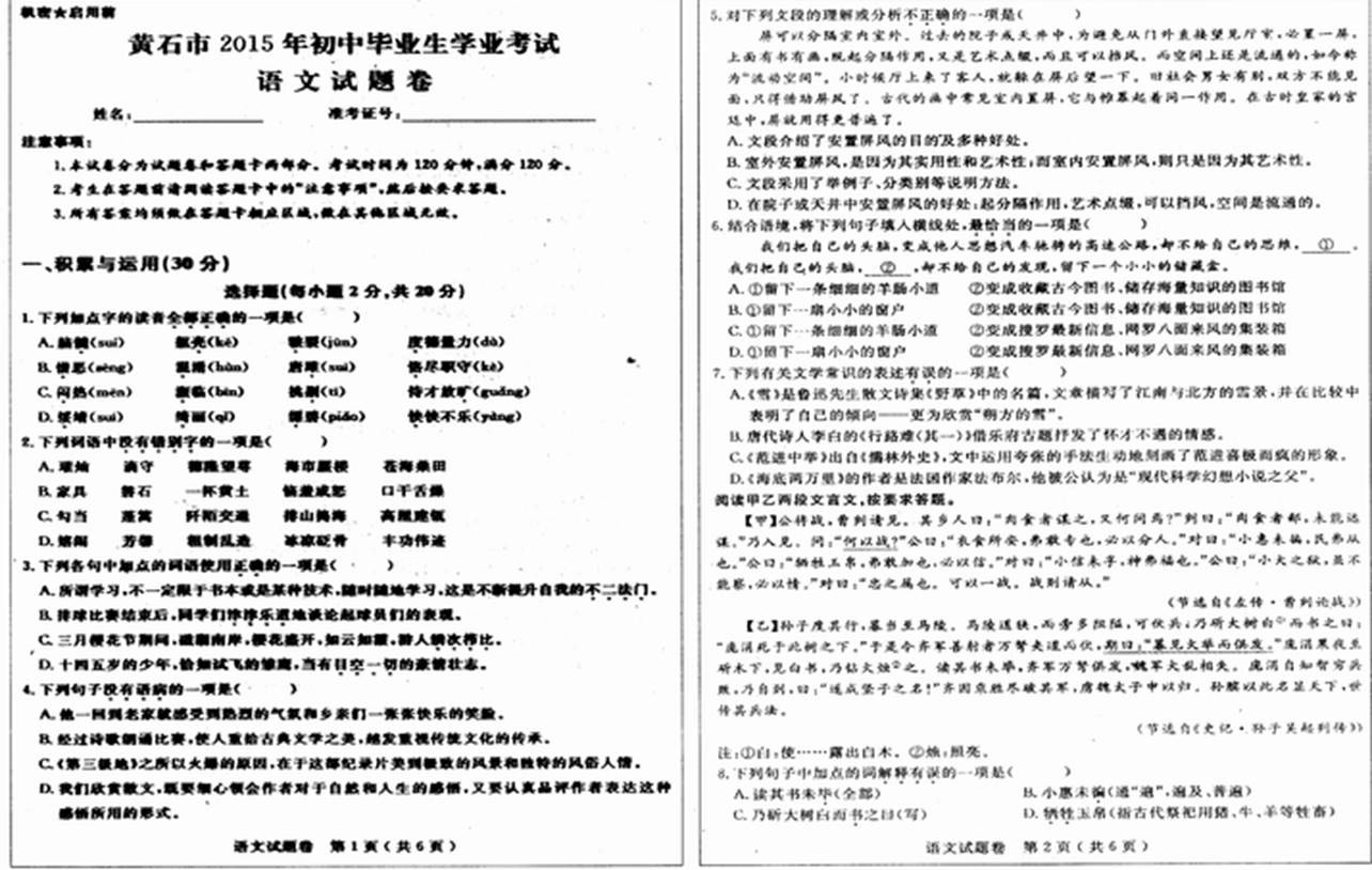 及时公布中考试题、答案和中考作文。祝各位考生都能取得好的成绩。2015年湖北黄石中考语文试题及答案(图片版):