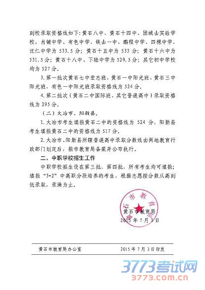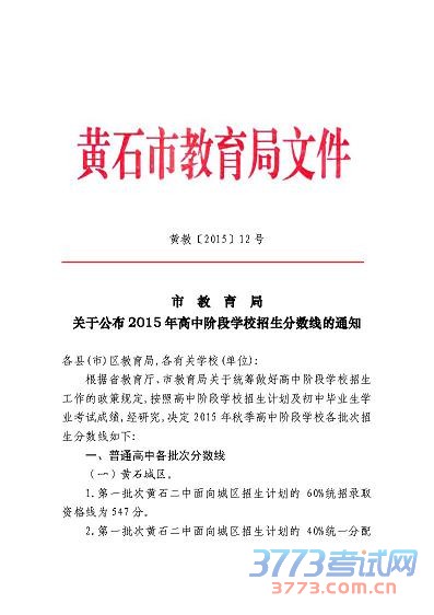 [组图]2015黄石中考分数线 黄石高中录取分数线