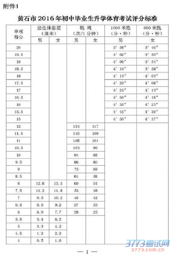 1.评分标准:参照《国家学生体质健康标准评分表》初三年级的标准,结合黄石实际,制定《黄石市2016年初中毕业生升学体育考试评分标准》。