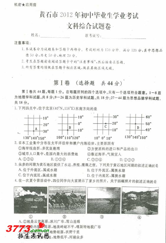 [组图]2012年黄石市中考文综地理试题及答案