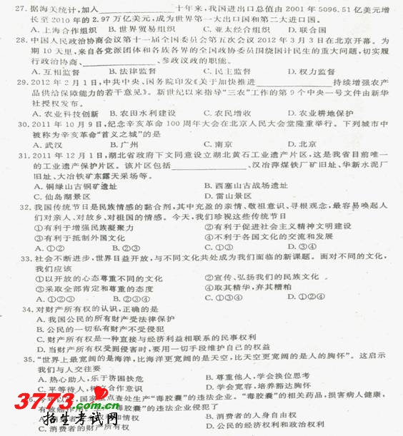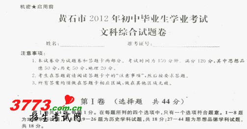 [组图]2012年黄石中考思想品德试题答案及评分标准