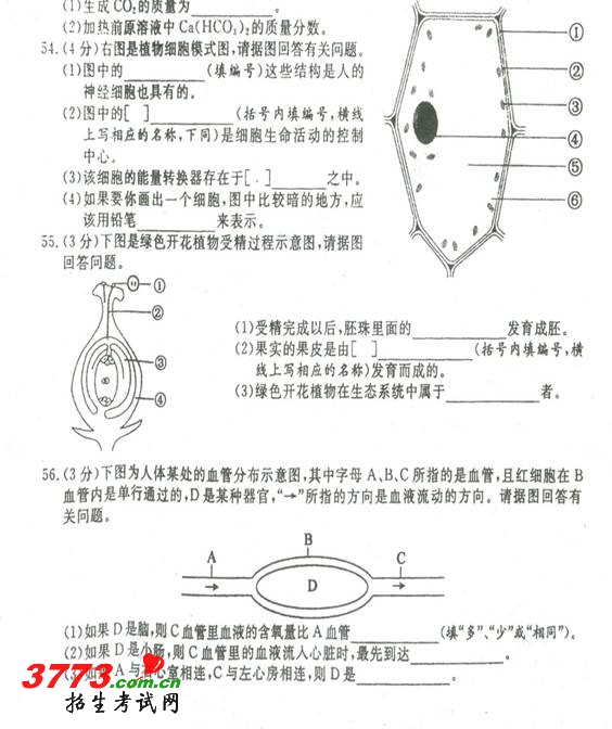 黄石市2012年初中毕业生学业考试生物学试题答案及评分标准