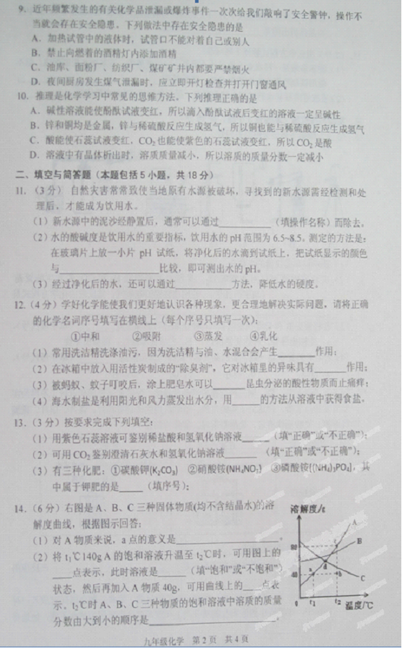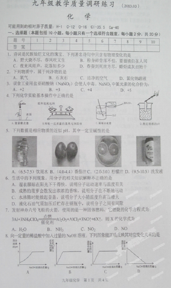 江苏省淮安市淮阴区2013届九年级3月月考化学试题
