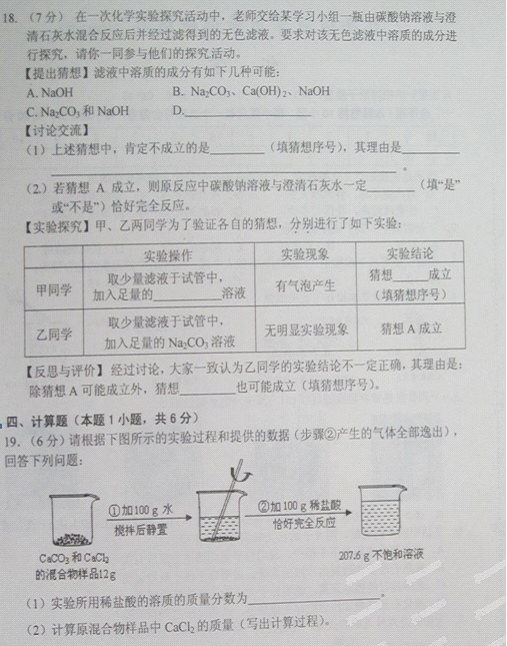18. (7分) 【提出猜想】 Ca(OH) 2和NaOH