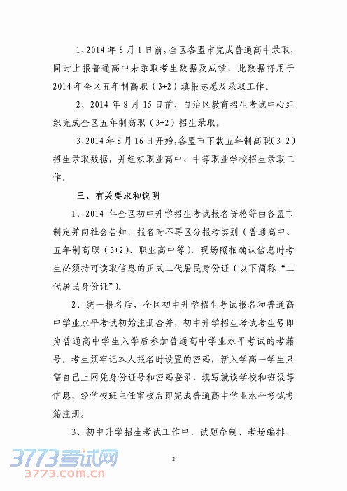 关于2014年全区初中升学招生考试统一网上报名、录取时段的通知