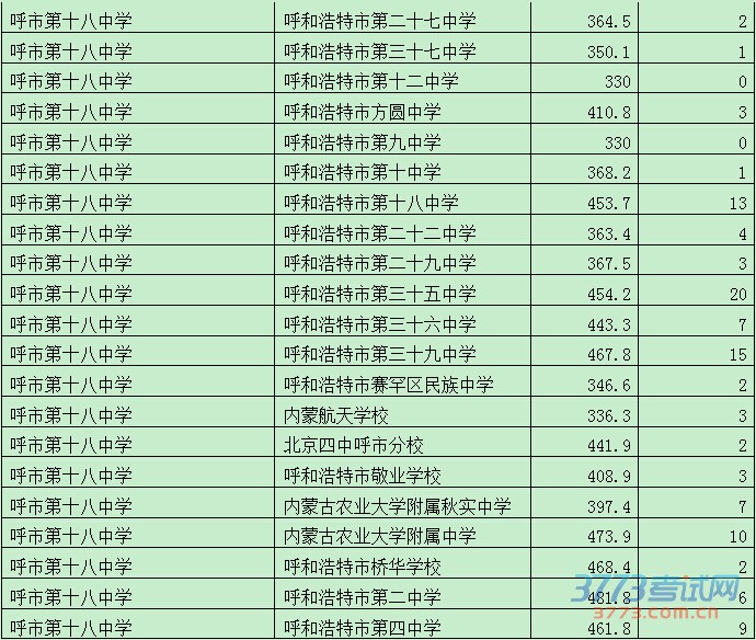 呼和浩特市第十八中学分招257人,最高录取分数线为481.8分,最低录取分数线为336.3分。