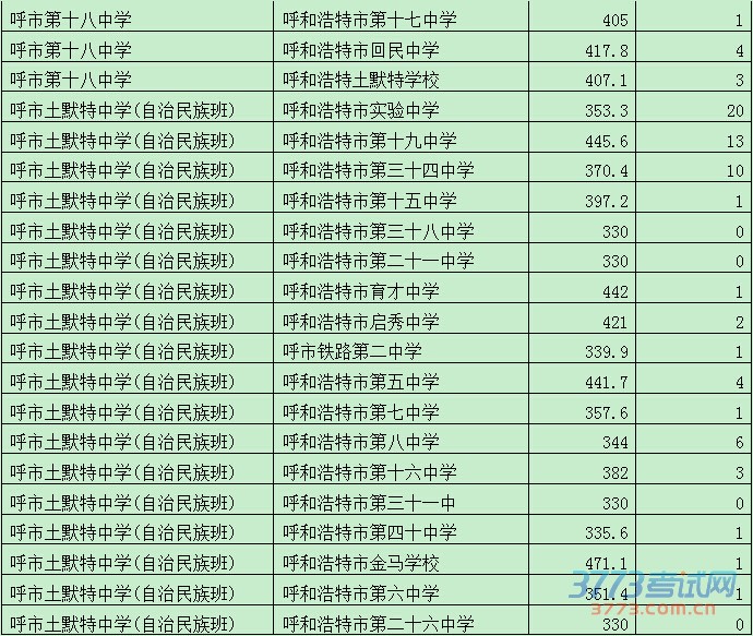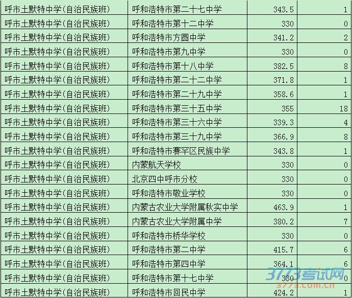 呼和浩特市土默特中学分招133人,最高录取分数线为471.1分,最低录取分数线为335.6分。