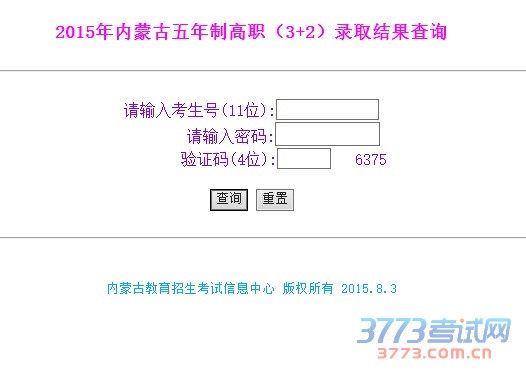 2015年内蒙古五年制高职(3+2)录取结果查询
