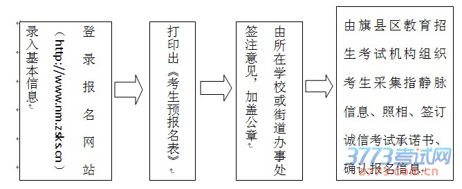 由旗县区教育招生考试机构组织考生进行采集指静脉信息、照相、签订诚信考试承诺书、确认报名信息。考生必须持二代居民身份证进行验证,否则,无法完成报名手续;丢失或未办理二代居民身份证的考生须提前到当地公安部门办理。