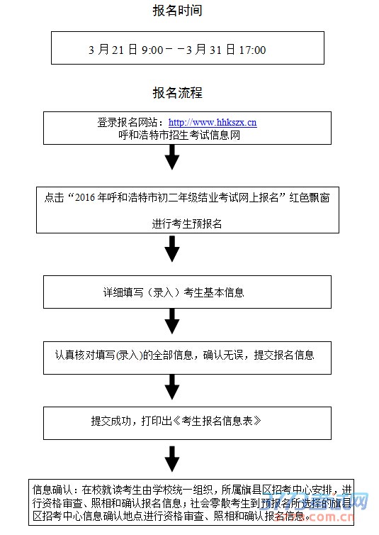 六、非在校就读(社会零散)考生信息确认时须携带:《2016年呼和浩特市初二年级结业考试考生报名信息表》和二代居民身份证。