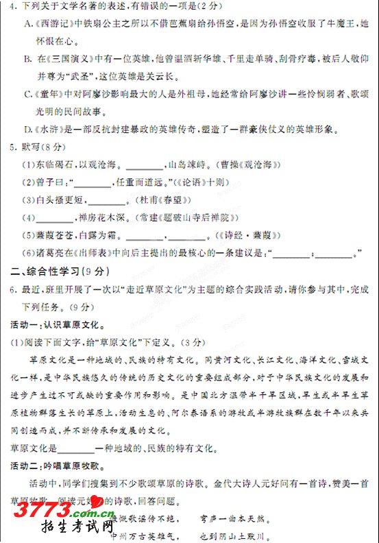 [组图]2012年内蒙古呼和浩特市中考语文试题及答案