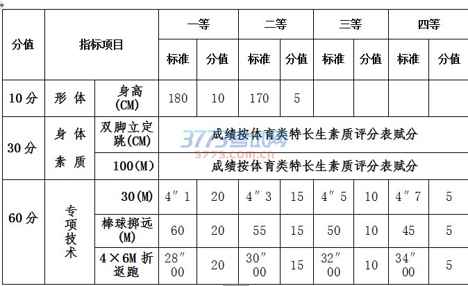 注:1.满分100分。100米(20%)、双脚立定跳(10%)按葫芦岛市普通高中体育类特长生素质评分表赋分。