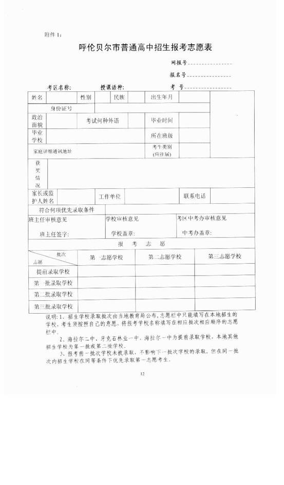 (4)海拉尔一中的招生工作,由市教育局民教科与海拉尔一中共同完成。各旗市区中考办要将报有海一中志愿的考生志愿表和名单于7月25日前报送到市教育局民教科,以便及时录取。