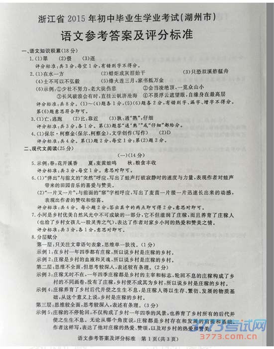 及时公布湖州中考试题、答案和中考作文。祝各位考生都能取得好的成绩。2015湖州中考语文试题答案(图片版):