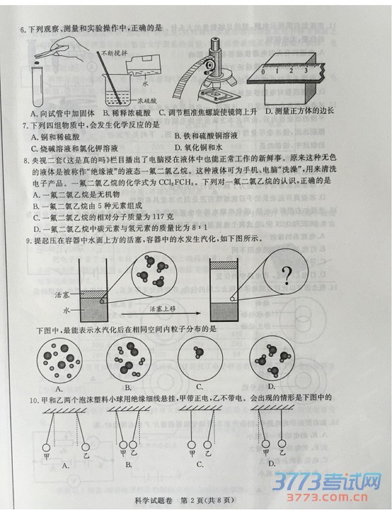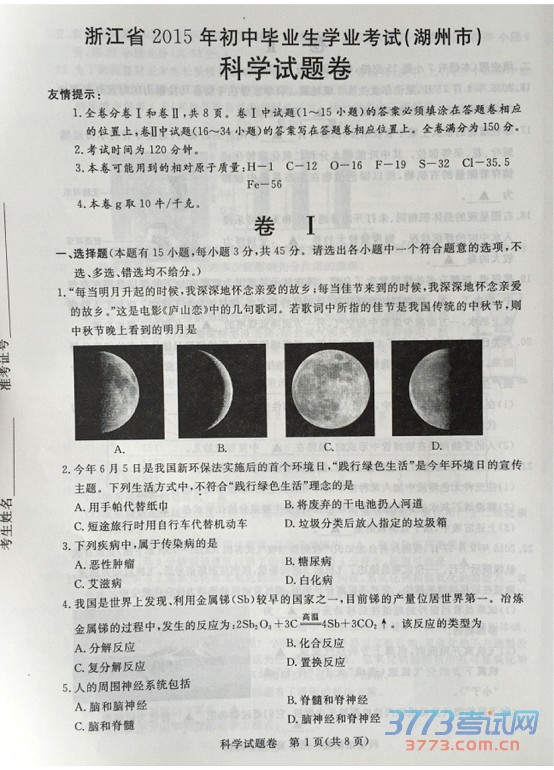 [组图]2015湖州中考科学试题及答案发布