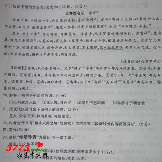 [组图]2012年湖州中考语文试题卷答案及评分标准