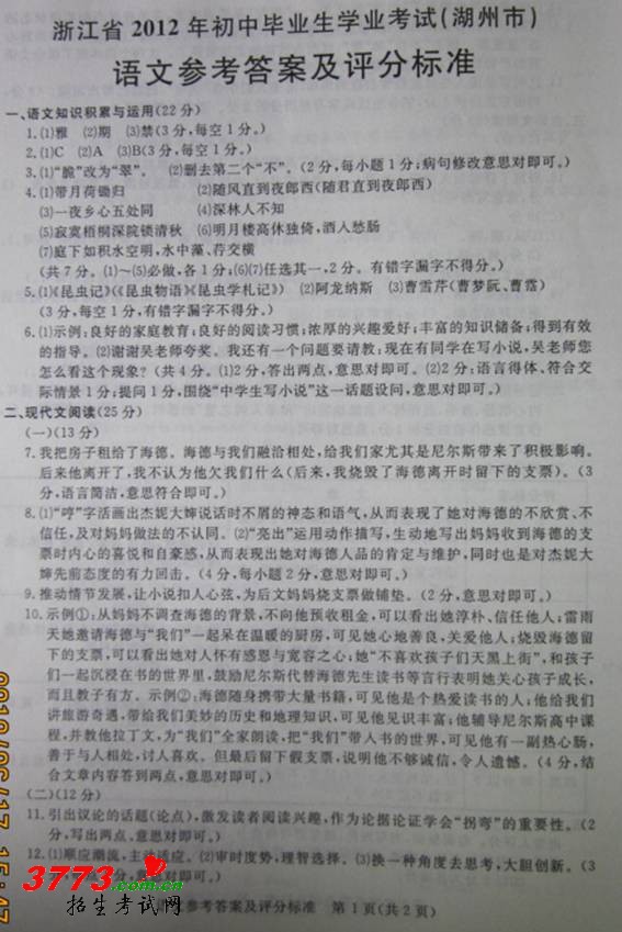 [组图]2012年湖州中考语文试题卷答案及评分标准