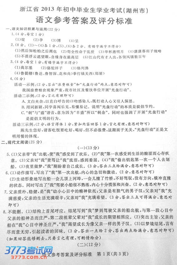 [组图]2013湖州中考语文答案评分标准(含试题)
