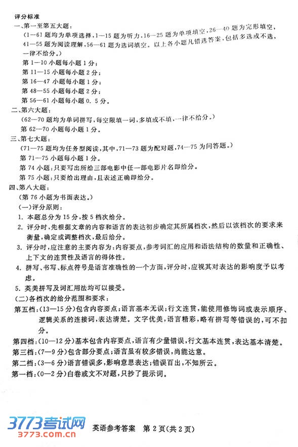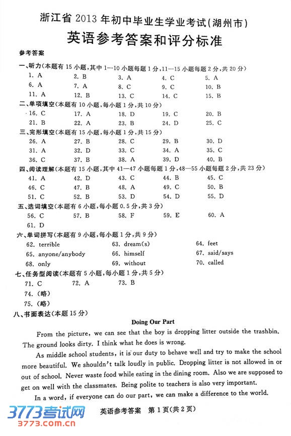 [组图]2013湖州中考英语答案评分标准(含试题)