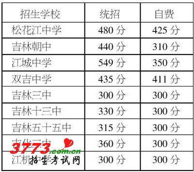 7月11日下午,吉林市2012年普通高中招生录取分数线正式公布。吉林一中:统招生589分,自费生582分;毓文中学:统招生572分,自费生541分;吉化一中:统招生572分,自费生541分;吉林十二中:统招生550分,自费生497分……
