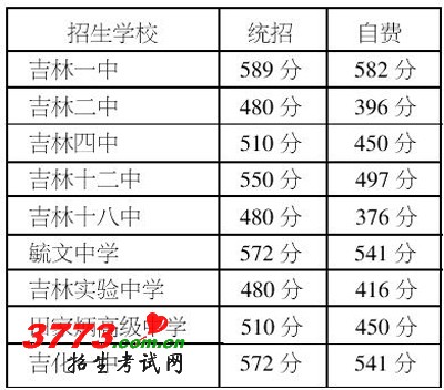 7月11日下午,我市2012年普通高中招生录取分数线正式公布。吉林一中:统招生589分,自费生582分;毓文中学:统招生572分,自费生541分;吉化一中:统招生572分,自费生541分;吉林十二中:统招生550分,自费生497分……