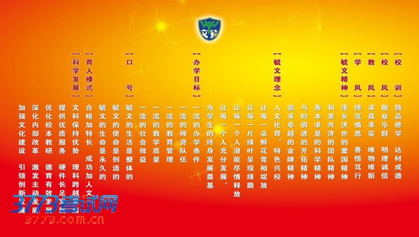 Observing the motto, "Develop morals. Spread knowledge. Cultivate talent. Promote character ",all the teachers in our school spare no efforts to define the strong Yu-Wen soul and shape an everlasting Yu-Wen spirit, which is cultivated by both past and present Yu-Wen students. Gradually we establish firmly “the school spirit of reasonable integrity, respecting work and enjoying company, the teaching style of seeking truth and new methods and being pragmatic and the style of study of expo deliberating and good sense”. In order to face the opportunity and challenge we strongly believe in maintaining the "six first-classes", which are " first-class humanitarian education, first-class school conditions, first-class teaching staff, first-class educational management, first-class teaching quality, first-class social benefits".