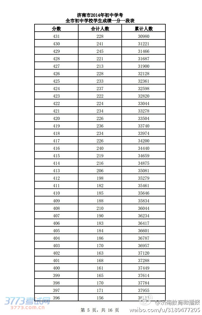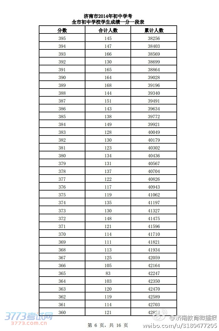 [组图]2014济南中考学考成绩一分一段表