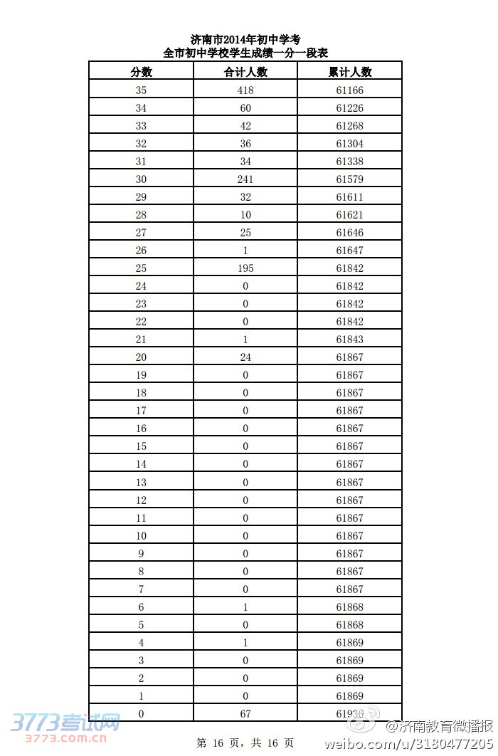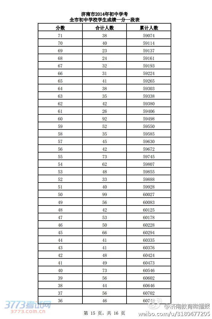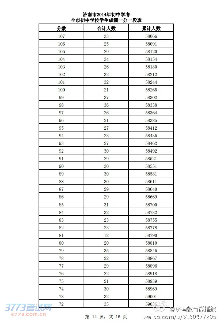 [组图]2014济南中考分数段公布(一分一段表)