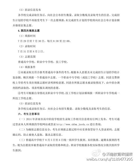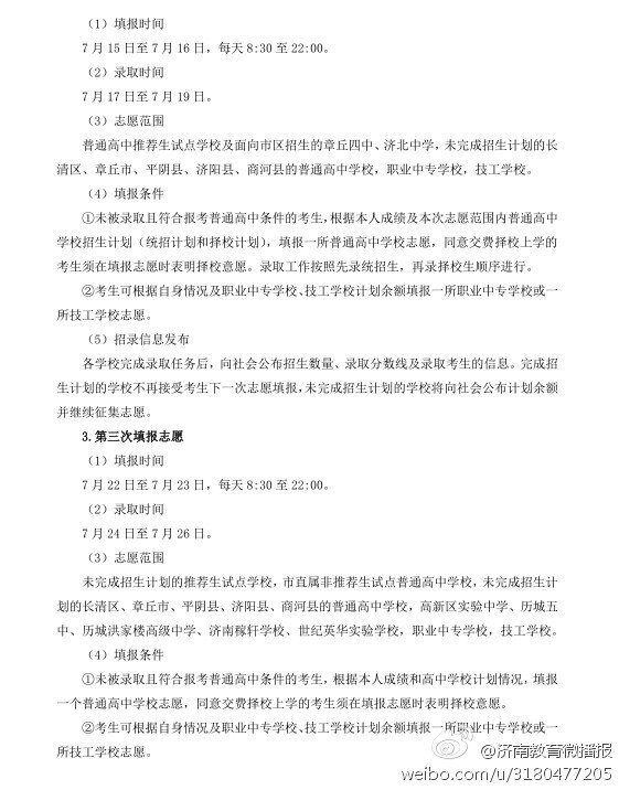 【关于网友询问录取分数线的回复】每个考生最多有4次填报志愿的机会,志愿填报及录取时间:7.8--9(录取7.10--12)7.15--16(录取7.17--19)7.22--23(录取7.24--26)7.29--30(录取7.31--8.2)每批次录取完成后公布各校招生数量、录取分数线及录取考生的信息。详询志愿填程序及要求。