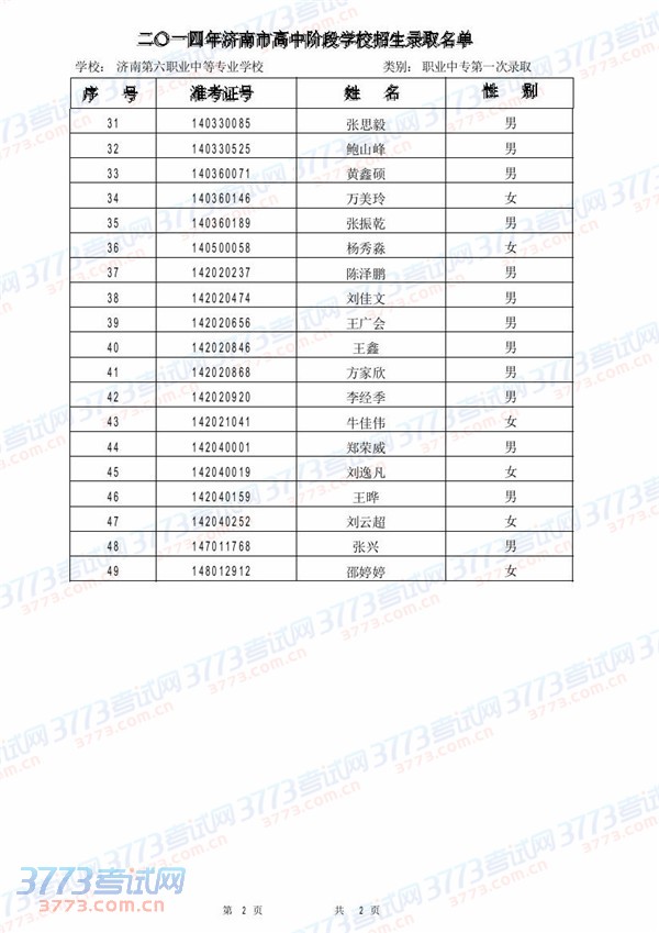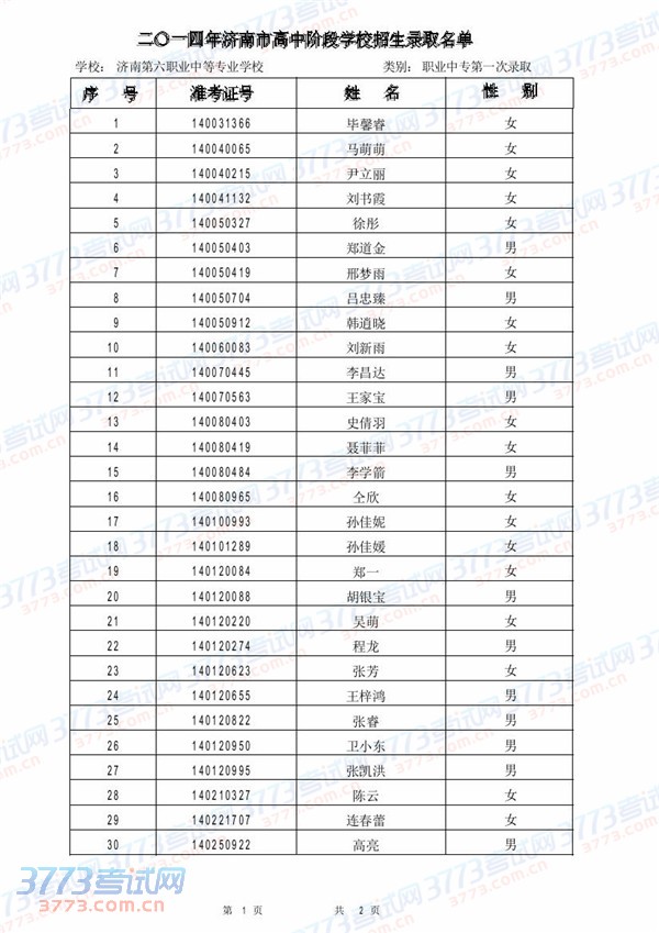 [组图]2014济南第六职业中专学校录取名单(第一次)