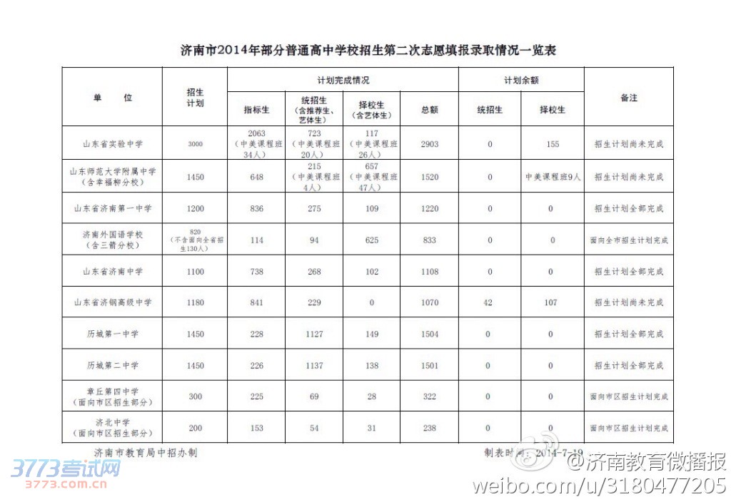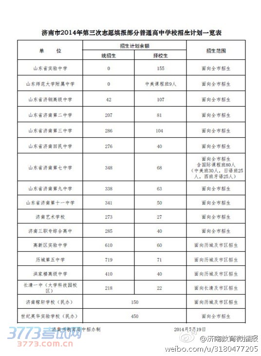 [组图]2014济南中考第三次志愿填报高中招生计划