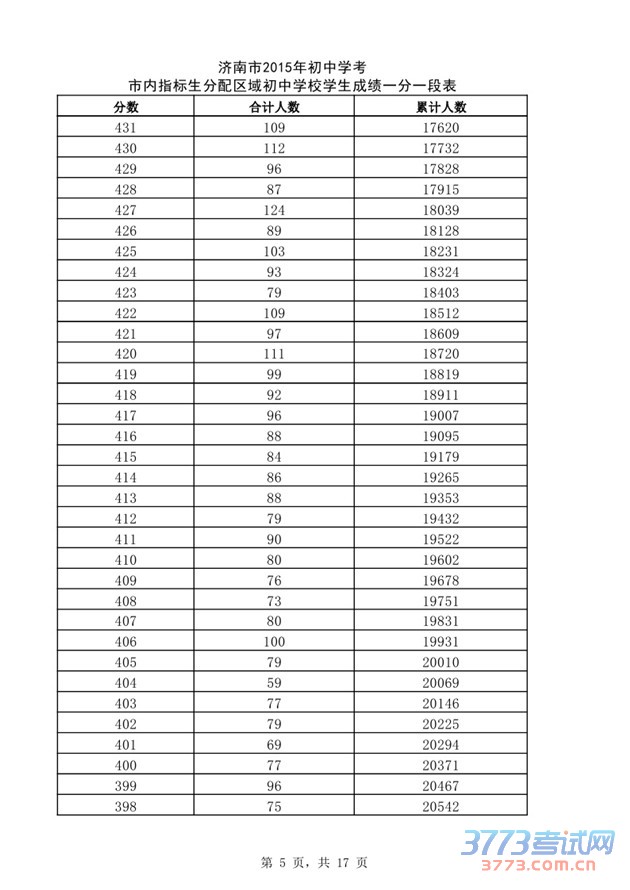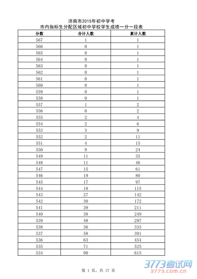 济南市2015年初中学考市内指标生分配区域初中学校学生成绩一分一段表