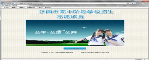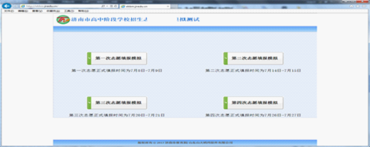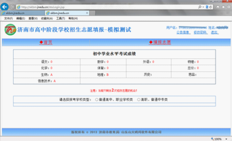 3、登录系统后,系统将显示当前公告,点击链接可以查看公告详情。通过查看公告,学生可以检索到教育局发布的志愿填报的相关信息及招生学校代码(或专业代码),点击“关闭公告信息”按钮可关闭公告窗口。 学生在菜单栏点击“填报志愿”链接,可以进行志愿填报。(图4)
