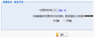 4、根据高中阶段学校招生志愿填报程序及要求,考生选择需填报的志愿类型。如:普通高中、职业学校类、高职普通中专类等,输入学校代码,进行填报。如果某次某普通高中有择校生计划,未达到志愿学校计划内录取分数线,且同意列入该校择校录取范围的考生,须选中“是否 同意列入该校择校录取范围”的选择框。(图5)