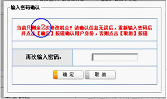 5、志愿信息填报完成后,须点击“提交”按钮。点击“提交”按钮后,提示学生当前剩余的修改机会次数,并要求学生再次输入密码确认(图6),密码确认后,系统开始提交学生填写的信息。
