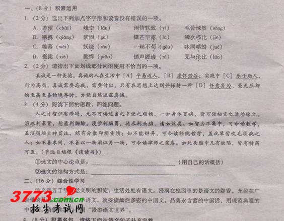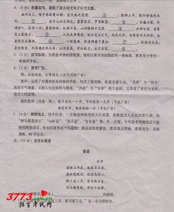 [组图]2012年湖北荆州市中考语文试题试卷及答案