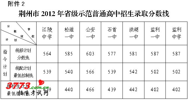 [图文]荆州市2012年省级示范普通高中招生录取分数线