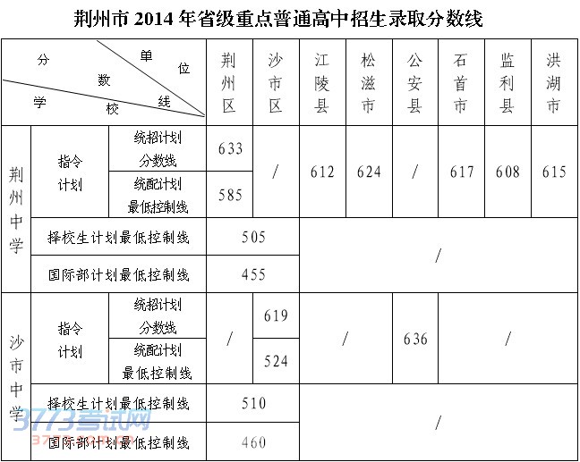 2014荆州中学沙市中学录取分数线 指令计划统招分数线统配计划分数线 择校生分数线,国际部计划分数线