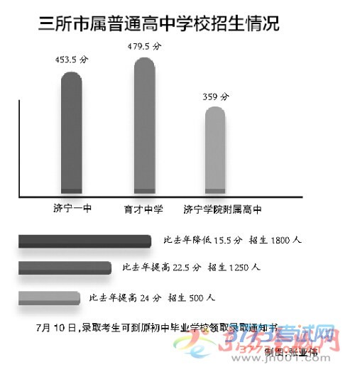 东方圣城网讯 (记者 鲍童 万德龙)7月2日,记者从济宁市招生考试院了解到,2015年全市普通高中招生考试成绩复核工作已经结束,划定的市属普通高中录取分数线也随之公布。备受考生及家长期待的济宁一中、育才中学以及济宁学院附属高中的分数线,分别为:453.5分、479.5分、359分。值得注意的是,今年,这三所市属普通高中学校面向兖州区招生,7月10日,录取考生可到原初中毕业学校领取录取通知书。